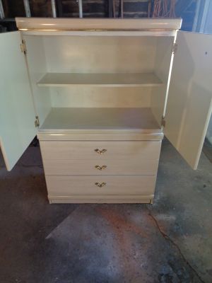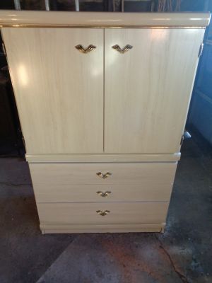 3 drawers, original gold hardware, top storage cabinet, has shelves, all natural wood,
